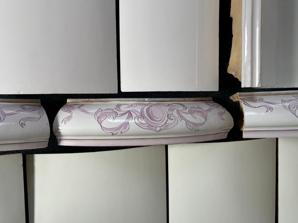 Mycket fin rektangulär kakelugn med en grundton i benvitt och guld detaljer.